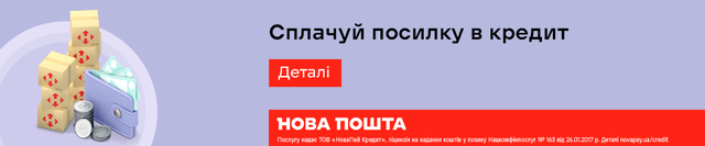 Замовляйте будь-які товари вартістю від 1 000 грн, що можна доставити з післяплатою до Нової пошти. Максимальна вартість посилки в кредит обмежена вашим персональним лімітом.