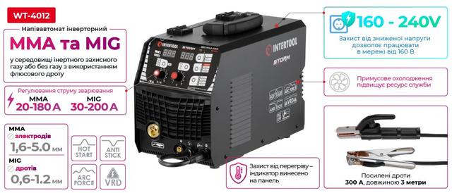 Інверторний напівавтомат для зварювання 5.6 кВа 20-200 А MIG/MMA-200A Storm Intertool WT-4012 зварювальний напівавтомат